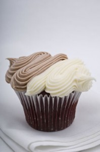 A red velvet cupcake frosted with half cocoa cream cheese frosting and half vanilla cream cheese frosting. Photo courtesy Yummy Cupcakes. |