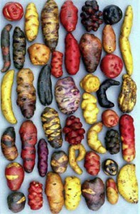 Potatoes originated in the Andes Mountains of Peru, where more than 2,000 varieties still grow wild (there are more than 4,000 varieties of potatoes worldwide). They were first domesticated more than 6,000 years ago. Don’t you wish you could buy some of these beauties, instead of the plain potatoes grown for the mass market? If you look closely, you’ll see versions that look similar to what we can buy today. What we can buy is based on which varieties: Wild potatoes are indigenous to the Andes Mountains in Peru, and were cultivated by the Incas. |