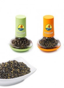 Pearls of fine caviar are dried via a proprietary technique that intensifies its flavor. The dried pearls are sold in a grinder that enables you to grind some caviar over your food (eggs, buttered toast, grilled fish or seafood, potatoes and pasta for starters). Or, you can open the grinder and sprinkle full pearls of the caviar on the food.