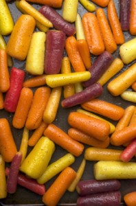 Baby carrots move beyond the familiar orange to purple, red and yellow. Photo courtesy Sprinkle Side Up. See her recipe for glazed rainbow carrots.