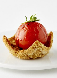 4. FILL each cup with a roasted cherry tomato, and drizzle a little sauce over top of each one. Garnish with thyme and serve immediately.
