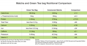 MATCHA TEA BENEFITS Matcha is the only tea that is ground into fine powder form, and incorporates the entire tea leaf; the powder is whisked into water to create a frothy drink. Other teas are consumed via steeping the tea leaves with hot water. The water is infused with the essence of the tea leaves, but the leaves themselves are disposed of. Only a small portion of the health benefits of tea are water soluble. According to Aiya, makers of Matcha To Go, depending on the tea variety and preparation, only 10% to 20% of the healthy nutrients are consumed when drinking steeped tea. Thus, matcha is far more healthful than other teas, delivering many more green tea antioxidants, amino acids including L-Theanine, vitamins, minerals and fiber. Here’s a comparison chart from the manufacturer: Find more matcha health information at Aiya-America.com. |