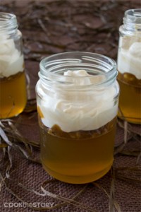 1. POUR 3 cups of the juice into a medium saucepan. Bring it to a boil over high heat. Meanwhile… 2. POUR the remaining cup of cold apple juice into a large bowl. Sprinkle the cold juice with the gelatin powder. Let stand for 1 minute. Add the boiling juice to the cold juice. Stir continuously for 3 minutes and then stir in the maple syrup or honey. 3. DIVIDE the apple juice mixture among 8 jars, glasses, or dessert bowls with an 8-10 ounce capacity. Refrigerate until set, about 3-4 hours. Once the jelly has set… 4. COMBINE the walnuts with the cinnamon and ¾ cup of caramel sauce. Divide evenly among the 8 containers. (Up until this point the recipe can be made up to 2 days ahead. Keep the containers refrigerated). When ready to serve… 5. MIX the remaining ¾ cup caramel sauce with the crème fraîche in a large bowl. Add about 1/3 of the whipped cream and stir it gently. Add the remaining whipped cream and gently fold it in just until it is combined (it’s alright if there are ribbons of caramel color through the cream). Divide the caramel cream among the containers. |