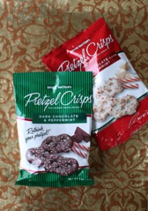 We love Pretzel Crisps year-round. The flat, bite-size pretzels are terrific for snacking from the bag, dipping into hummus or other dip favorite, topping with peanut butter and a slice of apple, or turning them into canapés, topped with cheese, ham, smoked salmon and so forth. Throughout the year, Pretzel Crisps are available in Original plus Chipotle Cheddar, Everything, Jalapeño Jack and Sesame. But for the holidays, the special goods come out: chocolate-coated pretzels with a garnish of crushed candy canes. They’re available in two versions: