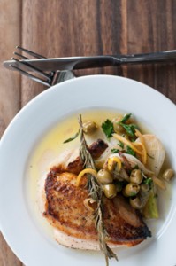 Preparation 1. PREHEAT oven to 400°F. Season chicken breasts with salt and pepper. 2. HEAT a large, heavy bottomed sauté pan over medium high heat. Add two tablespoons of olive oil to the pan. When hot, add the chicken breasts skin side down. Cook until skin is golden brown and the skin is crispy, about 4-5 minutes. 3. FLIP chicken breasts over, add the rosemary sprigs to the pan and place the entire pan in the oven. Cook until the chicken is just cooked through, about 10-12 minutes, or until a thermometer placed in the chicken reads 150°F. 4. REMOVE the chicken from the pan, add the olives, preserved lemons, lemon juice, parsley and about 1/4 cup extra virgin olive oil to the pan. Whisk to combine; this will be the sauce. 5. DIVIDE the chicken among four plates, heat the sauce over medium heat and spoon evenly over the chicken breasts. Serve while hot and enjoy with a vegetable side such as roasted onions or carrots, plus a optional starch—rice or other grain, or crispy roasted potatoes.
