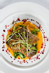 Grilled fish garnished with a bit of everything: balsamic droplets, pomegranate arils. Photo courtesy Rock Center Café | NYC.