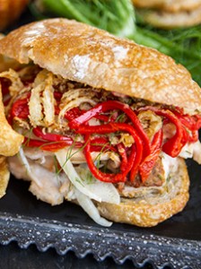 ![]() A porchetta sandwich served with fennel slaw, roasted red pepper, crispy fried onion threads and sriracha aïoli. Photo courtesy Flavor & The Menu. |