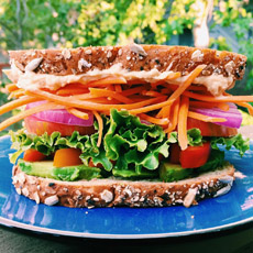 The first four Dave’s Killer Bread varieties (Blues, Good Seed, Nuts & Grains and Rockin’ Rye) launching at the Portland Farmers Market in 2005. Ten years later, it’s traversed the U.S. Waste no time in finding it, even if your local store has only one of the 14 loaves. Here’s a store locator. Discover more at DavesKillerBread.com. We had Dave’s Killer Bread for breakfast this morning, toasted. It’s so flavorful that it needs no spread. And since, as far as bread is concerned, Dave’s is as guilt-free as it gets, we’re deciding on what to put on our DKB sandwich for lunch: |