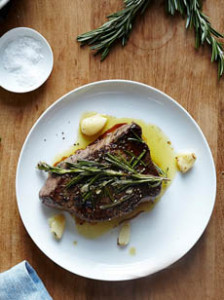 Top: Pan-grilled steak atop a pool of garlic-infused olive oil. Photo courtesy Quinciple. Second: Grilled salmon on a plate rimmed with basil olive oil and a garnish of gremolata: finely chopped parsley, garlic and lemon zest. Photo courtesy Eddie Merlot’s. Third: Have fun with it: Use a squeeze bottle to turn your sauce into polka dots or zig-zags. Photo courtesy Strip House. Fourth: A can of San Marzano tomatoes becomes a quick sauce. Photo courtesy Williams-Sonoma.