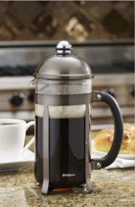 The average American drinks 2.1 cups of coffee a day. Collectively, Americans drink 4,630 cups of coffee each second. And September 29th is National Coffee Day. Cold brew coffee, which has been around quite a while (we’ve had a Toddy cold brew system for 20+ years), has finally hit the mainstream. Coffee drinkers find it has superior flavor; and in the summer, iced coffee is as easy as adding cold water to cold-brew concentrate from the fridge. (Here are some well-reviewed brands). Companies from Folgers to Blue Bottle sell cold-brew coffee. You can buy large bottles of concentrate; you can buy grab-and-go 16-ounce bottles. Yet, if you have a French press, you can make trendy cold brew coffee without purchasing a special cold brew system or a bottle of ready-brewed. The French press recipe is below. But first: A French press is a coffee-brewing device consisting of a pot with a removable plunger made of fine mesh. Coarse-ground coffee is added to the pot, followed by boiling water. The plunger device is placed on top. The coffee grounds float in the water. When the coffee is ready to be poured, the plunger is employed. As it is pushed down, the grounds are pushed to the bottom. It does not use electricity; although you likely need it to heat the water. If you have a French press, there’s no need to buy a cold brew system, or pricey bottles of cold brew coffee at retail. Today, you can find coffee presses in stainless steel, in a stainless holder with a glass beaker (photo #1), and in plastic. French presses are made in sizes from 1-2 cups to 10 cups or more. There are travel mug versions, of course: We use this coffee press “mug” from Bodum. French press or coffee press is the name in English; although in In New Zealand, Australia and South Africa, the apparatus is known as a coffee plunger. In France it is called cafetière à piston; in Italy it is a caffettiera a stantuffo. You can use a French press to brew loose tea as well, but don’t use a press that is used to brew coffee. Even after washing, microscopic bits of coffee oil can cling to the glass or metal, imparting an unwelcome undertaste to the tea. |