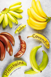 Love bananas? Check out this history of bananas for August 27th, National Banana Lovers Day (April 21st is, simply, Banana Day—another day to re-read your banana history). But first: While you’re on a long conference call, or waiting for an internet connection that’s taking its time, show your love by decorating a banana (photo #1). > Then enjoy the history of bananas, below. > Also below are America’s favorite banana-based dishes. > Be sure to take a look at this beautiful banana comparison photo, below. The original, wild, banana was tiny and filled with large seeds the size of peppercorns (photo #2). Bananas were first domesticated in Southeast Asia and Papua New Guinea, by at least 5000 B.C.E. and possibly as far back as 8000 B.C.E. Southeast Asia has the largest diversity of banana species, followed by Africa, indicating a long history of banana cultivation in those regions (source). Over millennia, bananas were bred into the fleshy fruits (botanically, they’re the not fruits but the berries** of herbs) we know today. Many wild banana species can still be found in China, India and Southeast Asia, in the areas south of China, east of India, west of New Guinea and north of Australia. They require a tropical or sub-tropical climate. A 2001 New Yorker article notes: “More than a thousand varieties of banana exist worldwide. The vast majority are not viable for export: Their bunches are too small, their skin is too thin, or their pulp is too bland.” Numerous of these varieties are plantains, are starchy and inedible until cooked (there’s more on plantains below). The article continues: “There are fuzzy bananas whose skins are bubblegum pink; green-and-white striped bananas with pulp the color of orange sherbet; bananas that, when cooked, taste like strawberries (photo #3). “The Double Mahoi plant can produce two bunches at once. The Chinese name of the aromatic Go San Heong banana means “You can smell it from the next mountain.’ The fingers on one banana plant grow fused; another produces bunches of a thousand fingers, each only an inch long.” Alexander the Great introduced bananas to what is now Western Europe in 327 B.C.E. They were brought back from his campaigns in Asia and India, China and Southeast Asia. It took centuries after that—around 800 C.E.—for bananas to make their way to the Middle East. By the 10th century, the banana appears in texts from Palestine and Egypt. From there it diffused into North Africa and Muslim Iberia (southern Spain). During the Medieval Ages, bananas from Granada were considered among the best in the Arab world [source]. Bananas were introduced to the New World in the 16th century via Portuguese sailing ships, which carried them from West Africa to South America. The fruit’s name comes from a West African language [Wolof, the major language in what is now Senegal] where banan means finger. In 1870, a Cape Cod fishing-boat captain named Lorenzo Dow Baker imported 160 bunches of bananas from Jamaica to to Jersey City, New Jersey: the first bananas in the U.S. Shopkeepers hung the bunches and cut off the number of bananas requested by the customer. By 1900 Americans were 15 million bunches of bananas annually; 40 million by 1910. Twenty years later, Baker’s company was renamed United Fruit, today called Chiquita Brands. By the 1960, United Fruit controlled nearly seven hundred million acres of land and 90% of the American banana market. If you’ve had bananas in other countries and find our American imports to be bland in comparison, that’s because the original species Baker imported, the Gros Michel, has long since been replaced by the Cavendish—a blander variety that travels more easily. Many thanks to Wayne Ferrebee for much of this information. Over millennia, farmers hybridized wild species of bananas and selectively bred the different strains into varieties called cultivars. The most delicious exportable cultivar was Gros Michel (Fat Michael, Musa acuminata AAA)—so ideal for farming, transporting and retailing that became more than 80% of bananas cultivated worldwide (here’s more about the variety). A half a century ago, the Gros Michel banana was the principal banana variety imported to the U.S (photo #5, below). They were/are far tastier than the current Cavendish variety: creamier with a tropical fruit taste. The world’s current major banana crop in the world, the Cavendish banana, was grown by a gardener of the William Cavendish, 6th Duke Devonshire, in 1830. He was president of the Royal Horticultural Society. Using a specimen from a lot sent to the Duke by a colleague in Mauritius, the Duke’s head gardener, Joseph Paxton nurtured it and, five years later, the plant flowered and bore fruit. He named the varietal Musa cavendishii, after the family name of the Dukes of Devonshire, Cavendish. He himself became Sir Joseph Paxton for his contribution to England. Cavendish plants were sent with missionaries to Samoa and other South Sea islands, the Pacific and the Canary Islands [source]. When the Gros Michel was wiped out, banana growers turned to the Cavendish. It was a smaller and less tasty fruit, but it was immune to the fungus, able to grow in infected soils, and traveled well. Practically all bananas exported to foreign markets were Cavendish. For decades, practically all bananas exported to foreign markets—China, Europe, North America, etc.—are clones of the first Cavendish plant. Alas, Panama disease has mutated into a new, deadlier strain (Race IV) that not only kills off the Cavendish, but also numerous local breeds of banana around the world. The world is currently in a banana crisis. You can find more information about it online, starting here. Plantains, native to India, are used worldwide in ways similar to potatoes. They are very popular in Western Africa and the Caribbean countries, typically fried or baked. Since popular brands like Dole put their stickers on bananas and plantains a