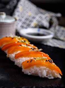 [4] Vegan Sushi: What looks like tuna is bell pepper. Here’s the recipe from Olives For Dinner.