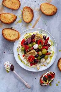 Your family and guests won’t believe how easy it is to make this appetizer or snack: crostini with a “fully loaded” goat cheese spread. Put a twist on the standard appetizer spread with a creamy goat cheese spread, a drizzle of flavorful oil and your favorite antipasto ingredients. We simply went online and ordered the antipasto ingredients from DeLallo, purveyor of fine Italian groceries (they also provided the recipe). The recipe serves from two hungry people to 6-8 adults seeking just a bite with a glass of wine. It’s a crowd pleaser that certainly brightens up the day! Ingredients 1. WHISK the ricotta and goat cheese until smooth in a medium mixing bowl. Spread cheese mixture on a serving dish (see photo). 2. TOP the cheese spread with olives and antipasti. Drizzle oil on top and serve with the accompaniments. You can bake the crostini up to a week in advance. Once cool, store them at room temperature in a resealable plastic bag. For extra flavor, substitute a flavored olive oil, such as garlic- or herb-infused oil. For added heat, chili-infused oil works, too. |