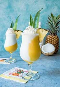 National Piña Colada Day is July 10th, celebrating one of our personal favorite cocktails. It may be a few weeks past that date, but this delicious recipe has arrived, just in time for a weekend indulgence. You can see from the photo that this isn’t your ordinary Piña Colada. Preparing the coconut cream and pineapple into two different layers gives it more eye appeal than any Piña Colada we’ve ever seen. The recipe was developed by Shanna of Pineapple & Coconut, and shared with us by Kōloa Rum, a dazzling line of artisan rums from Hawaii (here’s our review). Koloa rums are made in small batches, with pure sugar cane instead of the cheaper molasses used by most rums. It’s a great gift for a rum connoisseur. Next step: Pick up the ingredients, and get ready to kick back this weekend with a glassful of rum yum. Instead of cutting and freezing fresh fruit, buy frozen fruit, already cut. It saves time and money. In a perfect world you’d have Hurricane glasses for your Piña Colada (photo #1), but any large glass (ideally 20 ounces) will do. Select the garnishes that call out to you. One garnish is fine, as are two. Go overboard by combining them all. Trivia: Piña Colada means strained (colada) pineapple (piña). Ingredients For 2 Drinks For The Golden Purée Layer 1. COMBINE the pineapple, mango, rum and pineapple juice in a blender. Blend until smooth but still very thick and frozen. 2. POUR into a large jar or other container and keep in the freezer until you’re ready to assemble the drink. Then… 3. RINSE the blender then make the coconut layer. Combine all the coconut layer ingredients in the blender and purée until smooth but still thick and frozen. Add more ice if needed. 4. ADD the golden purée to the glass and tilt as shown in photo #1. Then top with the coconut purée. Leave it as is for a layered look; stir it slightly for a swirled look. 5. GARNISH as desired. Shanna recommends whipped cream sprinkled with a little ground allspice and some freshly shredded coconut. We used a bit of whipped cream as a base for Dang Toasted Coconut Chips. |