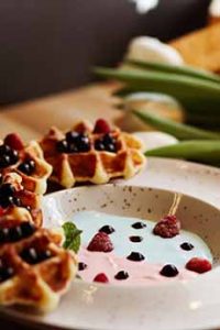 This article is ostensibly about rim garnishes for bowls or plates with enough of a rim to garnish. But in honor of International Waffle Day on March 25th, and National Waffle Day on August 24th, we’re featuring a mini dipping waffle along with the more logical rim candidates. There’s no need to wait for a waffle holiday or even for brunch: You can make this dipping waffles recipe work (photo #4) any day of the year, in either a savory or sweet preparation. The mini waffles recipe below. (photo #4). We’d long wanted a set of wide-rim bowls (photo #1) that the better restaurants we patronize use to serve pasta, soup, and other foods. The presentation never ceases to delight—especially when garnishes or decorations are set atop the wide rim. We listened to all the reasons why these bowls were not a wise purchase: no more storage space in our small apartment, questionable number of uses per year, etc. To those who questioned our judgment in buying a set of wide rim bowls (you know who you are!): We use our wide-rim bowls largely for entertaining, as opposed to daily use; but there’s no reason why you can’t do both. No matter what’s in the bowl (cereal, chili, fish en brodo, grain bowls, green salads, ice cream, pasta and pasta salad, pudding, salad, soup, etc.), you can plate other foods on the rim. Go wherever your imagination takes you, but here are some ways in which we “rim garnish” conventional foods: Truly, we have so much fun with this! For August 24th, National Waffle Day, we copied this idea for mini waffles with two dipping sauces. While in theory a breakfast dish, it was a great lunch! In this recipe (photo #4), the ingredients have reversed places: The main food is plated on the rim, and the garnishes are in the bowl. We didn’t have a mini waffle maker, so we made regular-size waffles and cut them into four smaller squares. As for the dip, we used strawberry and vanilla yogurt; and garnished everything with blueberries and raspberries. There are other waffle applications, too; for example: |