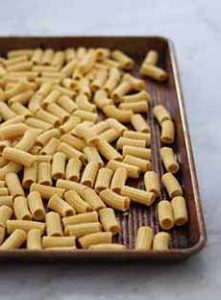 ________________ *Mezzi rigatoni, often misspelled in the U.S. as mezze rigatoni. Both word variations mean “half,” but rigatoni is a masculine noun and takes the masculine plural adjective, mezzi. Mezze would modify a feminine noun. †Manicotti is the Italian-American version of cannelloni. Manicotti tubes are ridged, larger and slightly thicker; cannelloni tubes are smooth, a bit smaller and slightly thinner. |