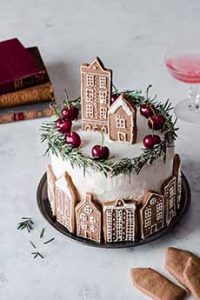[1] A dazzling Christmas ginger cake with gingerbread house cookie decor (photo © Bruna Branco | Unsplash).