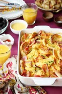 April 16th is National Eggs Benedict Day, celebrating the English muffin topped with Canadian bacon, a poached egg, hollandaise sauce, and chopped chives. We’ve got a twist on it: an Eggs Benedict Casserole recipe. Classic Eggs Benedict, a popular brunch item, was created in the 19th century by a prominent chef for a wealthy lady’s lunch. Some people love Eggs Benedict, but aren’t great at poaching the eggs that are a key part of the recipe. Go Bold With Butter has solved that problem with this clever Eggs Benedict Casserole (photo #1). The recipe was developed for them by Jonathan of The Candid Appetite. Candidly, we like this recipe a lot. It just might alternate with bagels and lox at our regular Sunday brunch. > Eggs Benedict Recipe Variations This recipe requires some advance preparation, so the casserole rest for 4 hours or overnight. The finished casserole gets a topping of hollandaise sauce, just like classic Eggs Benedict (photo #2). For The Casserole 1. GREASE a 9×13-inch baking dish with butter and set aside. 2. SPLIT open each English muffin and cut each piece in half. Arrange the slices on a baking sheet and drizzle with 2 tablespoons of melted butter. Bake until golden brown, about 10 to 12 minutes. Remove from the oven and let cool slightly. 3. PLACE half of the English muffin pieces in the prepared baking dish. Top with half of the Canadian bacon. Repeat with the remaining bread and bacon. 4. WHISK together in a large bowl the milk, eggs, salt, pepper, onion powder and garlic powder. Pour into the baking dish, over the bread and bacon. Cover with foil and chill for at least 4 hours or overnight. 5. REMOVE the baking dish from the fridge and allow to sit while you preheat the oven to 375°F. 6. BAKE, covered, for 35 minutes. Remove the foil and bake until the casserole is golden brown and a knife comes out clean when inserted in the middle, about 15 to 18 minutes. 7. MAKE the hollandaise sauce. Whisk the egg yolks and lemon juice in a large bowl until pale and doubled in size. Place over a pot of barely simmering water and cook, stirring constantly, until the egg yolks have warmed through, about 5 minutes. Keep the heat low and continue to whisk so as to not cook the eggs. (If you have a double boiler, this is the time to use it.) 8. SLOWLY WHISK in the melted butter in a slow steady stream, until the mixture comes together smoothly and has doubled and thickened. Season with salt and cayenne pepper. Cover and keep warm until ready to serve. If the sauce thickens too much as it sits, you can whisk in a tablespoon or so of warm water to loosen it up. 9. REMOVE the finished casserole from the oven and allow it to cool for 5 minutes. Top with the warm hollandaise sauce and garnish with chives and paprika before serving. |