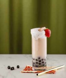 8. GARNISH the glass rim with a notched strawberry. Serve with wide boba straws or a long spoon to scoop up the boba.