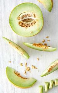 [3] The galia melon is a cross between a honeydew and a cantaloupe. The rind is netted like a cantaloupe, but the green flesh is like a honeydew. The flavor has notes of banana (photo © Melissa’s Produce).