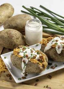 This recipe gives chicken wings a run for their money, says the Commission. Shredded chicken is smothered in a creamy combination of buffalo hot sauce, Cheddar cheese, and ranch dressing, then stuffed into a hearty baked potato.