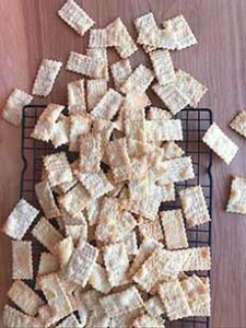 Crackers are made of flour, water, and salt. Some have other seasonings, but unlike bread, there is no leavening. There are different shapes of crackers—ovals, rings, rounds, squares, and triangles.