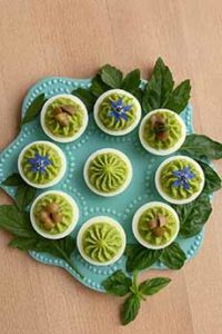 [1] You don’t have to be a whiz with a piping bag to enjoy this Green Goddess pesto deviled egg recipe (photos #1, #5, and #6 © Woodhouse Chocolate).