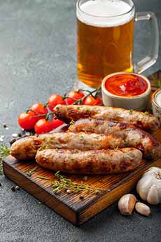 Few will argue that a bacon cheeseburger (photo #4) ranks #2 on the list of America’s favorite cheeseburgers, unless you dispute that it should, in fact, be #1. (The plain cheeseburger is #1, the rest of the list is in the footnote* below.) That juicy beef burger is topped with cheese and crispy bacon. But what if the cheese and bacon were tucked inside…bratwurst? And the brat was made with wagyu beef? What if there were a hot dog made the same way? There is—or more precisely, it’s bratwurst (photo #1). That’s what’s on offer from KC Cattle Company, a small veteran-owned-and-staffed ranch specializing in ultra-premium American Wagyu beef. Their classic Wagyu hot dogs were voted the best in the world by the editors of Food & Wine Magazine††, so the brats arrive on the scene with plenty of street cred! KC Cattle’s Brats are made with beautifully marbled 100% American Wagyu beef (no hormones or antibiotics) and stuffed with Cheddar and smoky bacon for a wondrous alternative to the cheeseburger. Backyard grilling meets gourmet indulgence, delivering bold, juicy flavor. They come in a one-pound four pack for $18.99 and ship all over the U.S. > Get your Wagyu Bacon Cheddar Bratwurst here. > The differences between bratwurst and hot dogs follow. > The history of bratwurst is below. > So are great bratwurst-condiment pairings. > And the year’s 16 sausage holidays! > Food 101: The difference between rolls and buns. (Brats, burgers, hot dogs, and all sandwiches go on rolls, not buns.) Bratwurst Both bratwurst and frankfurters are types of German sausage‡‡. The original frankfurter is far removed from modern hog dogs, as you’ll see below. (It’s what happens when big American food companies remake a product for more profit.) Bratwurst is essentially fresh sausage, made from coarsely-ground pork (sometimes mixed with beef or veal). They must be cooked before consuming. There is minimal processing and fewer additives than you’ll find in a hot dog. If you like texture, they offer much more than the “puréed” filling in hot dogs. Brats are thicker and longer than hot dogs—a more substantial meal or snack. They have a richer, more complex “meaty” flavor with more prominent seasonings (garlic, ginger, marjoram, nutmeg). Finally, bratwurst must be properly cooked through. They are often grilled or pan-fried, although a popular American tradition is to simmer them in beer first, often with onions. Hot Dogs Hot dogs are typically made from a mixture of meats (typically beef, pork, chicken, and turkey) that are finely ground into a smooth paste and mixed with fillers, preservatives, and various additives. They have a mild, processed taste. Since they’re precooked, so they just need reheating (or can be eaten as is from the fridge—especially if you’re a fraternity guy). Hot dogs can be boiled, grilled, or microwaved. While predecessors of the frankfurter originated in Frankfurt in the 13th century as “frankfurter würstchen,” traditionally made with pork and spices, one origin story credits a butcher from the German city of Coburg, in Bavaria, Johann Georghehner, with the modern version. He crafted a thinner sausage, the slender “dachshund,” or “little dog” sausage, in the late 1600s, and later brought it to Frankfurt to promote it. It was a classic sausage eaten with a knife and fork, no bun. That was an American addition (the history of the hot dog). It’s recorded that from the 1860s-1880s, on New York City’s Bowery, German immigrants sold traditional frankfurter sausages from pushcarts. In 1871, Charles Feltman, a baker who immigrated from Germany, launched the first Coney Island hot dog stand. He sold 3,684 “dachshund sausages” in a milk roll during his first year: an easy grab-and-go food for visitors there for recreation. The transformation from the authentic German frankfurter to highly-processed American hot dog happened gradually over several decades, with the most dramatic shift occurring in the early 1900s. Late 1800s-Early 1900s: The major shift in hot dog quality began with industrial meat processing and the rise of giant meat processing companies such as Chicago*-based Armour and Swift. Sausages became cheap industrial products. Hot dogs, in particular, were made of the unused parts that were left over, including non-desirable parts like the intestines. Big factories processed millions of animals a year. The nickel hot dog became omnipresent street food in Chicago. Cheap and filling, yet always suspect of being made of “mystery meat” (long before the advent of food labeling‡‡‡), hot dogs became notorious in the rumor mill for their questionable ingredients. The hot dog had evolved from a raw sausage to processed meat product made by mixing chopped meat with various curing ingredients, flavorings, and colorants. The slurry or meat emulsion, as the result was called, was then stuffed into a long casing, typical a cleaned animal intestine, and cooked. By the early 1900s, the German Frankfurter had been industrialized out of existence. The economic pressures of mass production, the need for shelf stability (they last much longer in the fridge, due to the precooking), and the desire for cheap food transformed it into the heavily processed junk† food we know today. It’s a classic example of how American industrial food production prioritized cost, convenience, and preservation over traditional quality and ingredients. Sausages were sold on strings until the 1950s. Sausages, including the first wave of American frankfurters/hot dogs, were traditionally sold on strings before the advent of modern plastic film packaging. Some artisan producers still use this technique (photo #12). In traditional European butcher shops, and subsequently in early American butcher shops, sausages were linked together in long chains and hung on strings or hooks. This served several practical purposes: 1950s: The rise of supermarkets and self-servi