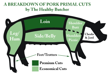 Ham is made from the back let of the pig. Chart courtesy TheHealthyButcher.com.